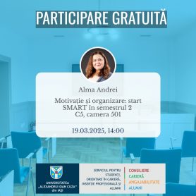 „Motivație și organizare: start SMART în Semestrul 2” este un atelier interactiv conceput pentru a te ajuta să îți recapeți motivația și să îți organizezi eficient timpul în noul semestru. Vei descoperi strategii practice pentru gestionarea sarcinilor academice, stabilirea obiectivelor realiste și menținerea echilibrului între facultate și activitățile extracurriculare. Prin exerciții aplicate și tehnici de management al timpului, vei învăța cum să eviți procrastinarea și să îți crești productivitatea, astfel încât să ai un semestru mai clar, mai bine structurat și fără stres inutil.