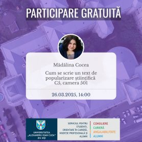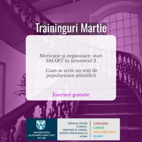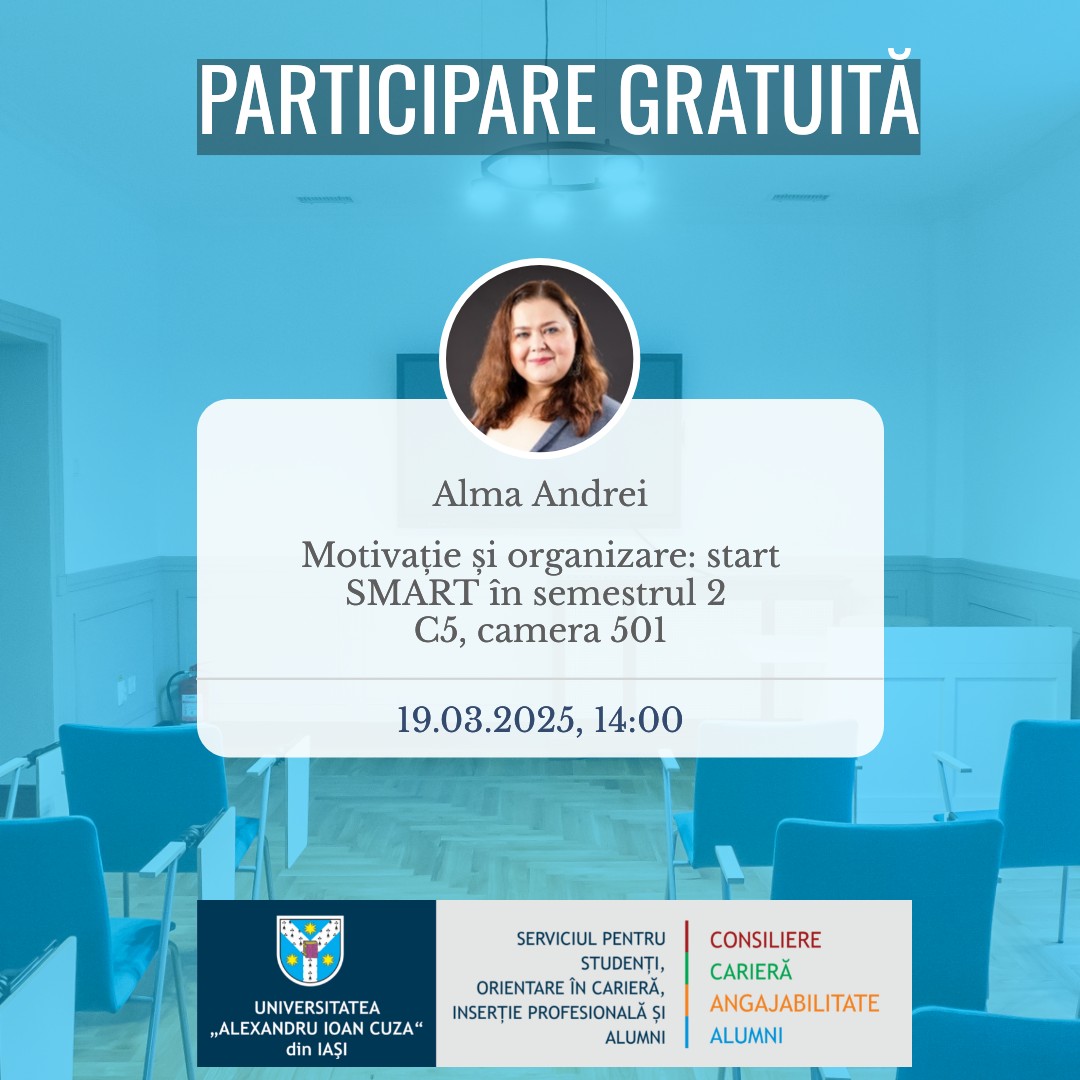 În luna martie, Serviciul pentru Studenți, Orientare în Carieră și Inserție Profesională și Alumni organizează două ateliere care te-ar putea ajuta în dezvoltarea profesională. Prima sesiune oferă strategii practice pentru organizarea eficientă și recăpătarea motivației în noul semestru, iar al doilea se concentrează pe dezvoltarea abilităților de comunicare a științei pentru tinerii cercetători.