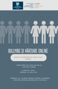 Te așteptăm pe 8 aprilie 2025, între orele 14:00 și 16:00, în sala 501 din Căminul C5 (campusul Codrescu), pentru a participa la discuția „Bullying și hărțuire online: Cum să te protejezi și să îți ajuți colegii”.
