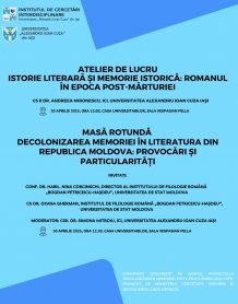 Departamentul de Științe Socio-Umane din cadrul Institutului de Cercetări Interdisciplinare al UAIC vă invită miercuri, 30 aprilie 2025, începând cu orele 11.00, în Sala Vespian Pella (Casa Universitarilor), la un Atelier de lucru cu tema: Istorie literară și memorie istorică: romanul în epoca post-mărturiei. Evenimentul este sustinut și coordonat de CSII dr. Andreea MIRONESCU și va fi urmat de o masă rotundă dedicată decolonizarii memoriei în literatura din Republica Moldova la care vor participa Conf. dr. habil. Nina Corcinschi, director al Institutului de Filologie Română „Bogdan Petriceicu-Hașdeu” din Republica Moldova si CS dr. Oxana Gherman, Institutul de Filologie Română „Bogdan Petriceicu-Hașdeu”, Republica Moldova. Evenimentul este organizat în cadrul proiectului PN-IV-P8-8.3-ROMD-2023-0178.