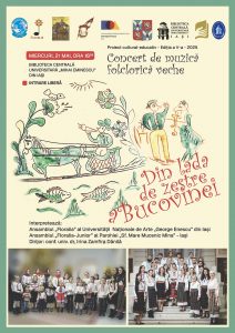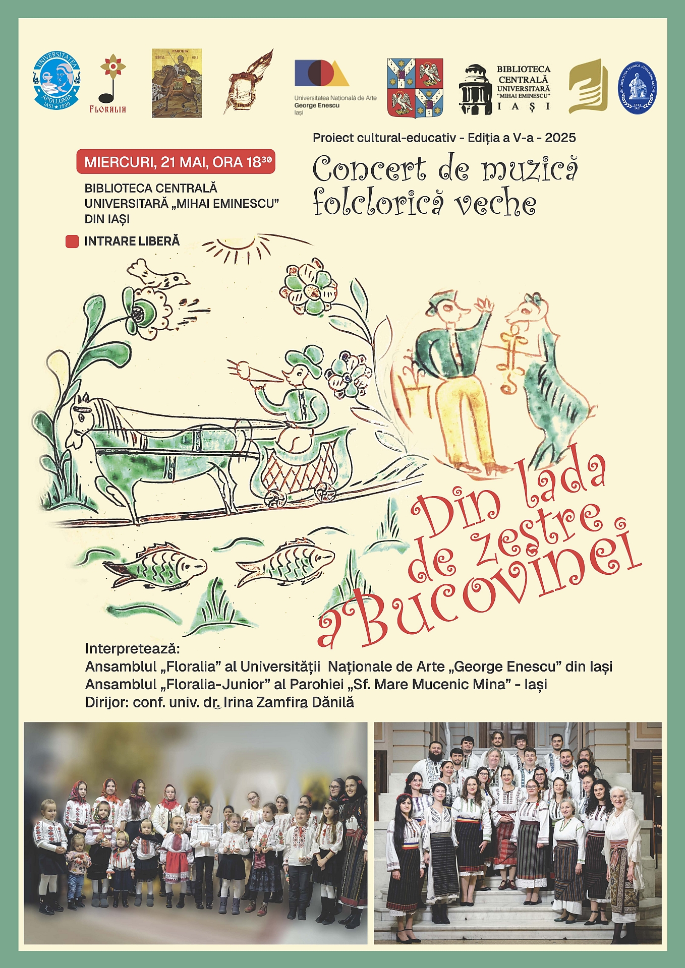 Miercuri, 21 mai 2025, ora 18.30, în Aula „Mihai Eminescu” a Bibliotecii Centrale Universitare „Mihai Eminescu” din Iași va avea loc Concertul de muzică folclorică veche „Din lada de zestre a Bucovinei”. Vor interpreta Ansamblul vocal-instrumental „Floralia” al Universității Naționale de Arte „George Enescu” din Iași și Ansamblul „Floralia Junior” al Parohiei „Sfântul Mare Mucenic Mina” – Iași, îndrumate și dirijate de conf. univ. dr. Irina Zamfira Bucescu-Dănilă de la Facultatea de Interpretare, Compoziție și Studii Muzicale Teoretice.