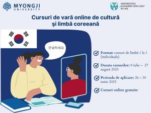 În perioada 9 iulie – 27 august 2025, Myongji University din Seul, Coreea de Sud organizează cursuri de vară online de cultură şi limbă coreeană. Cursurile se vor desfăşura în format 1 la 1 (individuale). Fiecare pereche formată dintr-un student coreean şi un student internațional va avea cel puţin 7 întâlniri online pe parcursul celor 7 săptămâni.