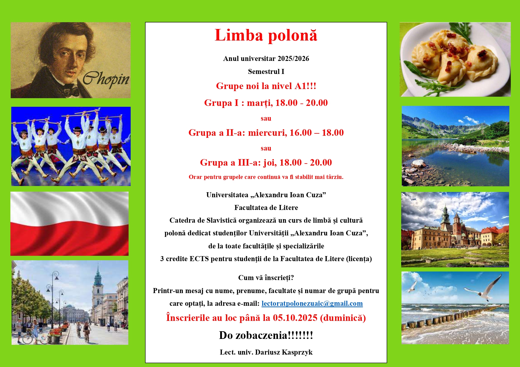 Facultatea de Litere și Catedra de Slavistică organizează un curs de limbă şi cultură polonă dedicat studenţilor Universităţii „Alexandru Ioan Cuza”, de la toate facultăţile şi specializările. Pentru înscrieri vă rog să trimiteți un mesaj cu nume, prenume, facultate și număr de grupa pentru care optați la adresa e-mail: lectoratpolonezuaic@gmail.comÎnscrierile au loc până la 05.10.2025