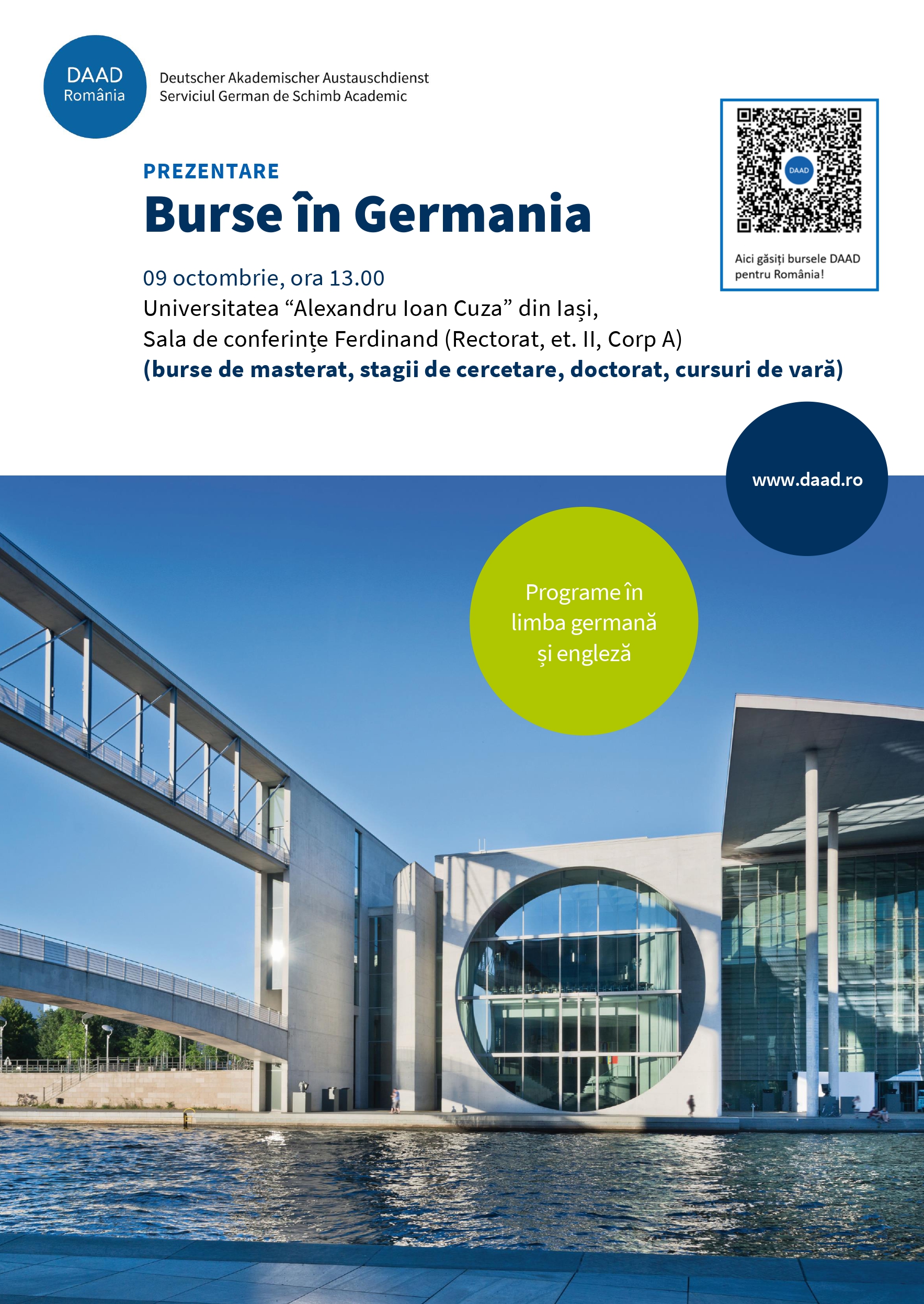 Universitatea „Alexandru Ioan Cuza” din Iaşi vă invită la prezentarea programelor de burse pentru studenți, masteranzi, doctoranzi, cadre didactice și cercetători, oferite de DAAD (Deutscher Akademischer Austauschdienst / German Academic Exchange Service) pentru 2026/2027.