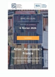 Fundația „Maison des Sciences de l’Homme” (FMSH) și Institutul Francez din România lansează apelul la candidaturi pentru programul Atlas România > Franța, destinat tinerilor cercetători post-doctoranzi care doresc să efectueze un stagiu de cercetare în Franța.