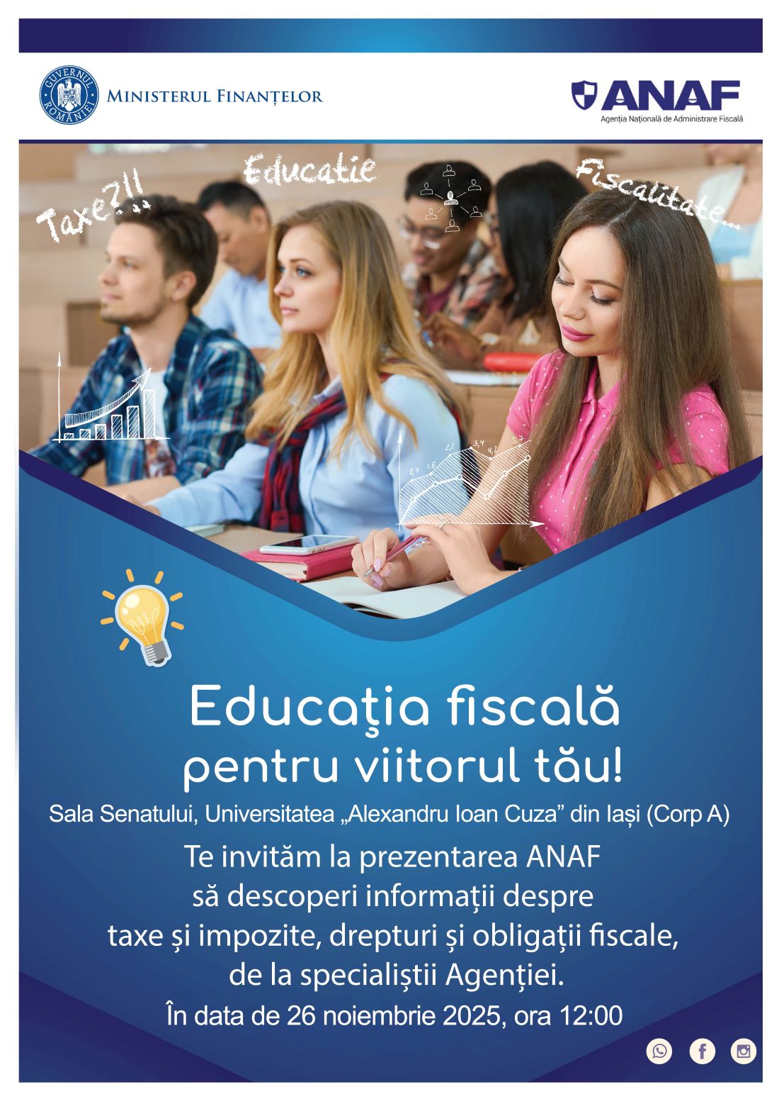 Miercuri, 26 noiembrie 2025, la ora 12.00, în Sala Senatului, studenții UAIC sunt invitați la o prezentare susținută de reprezentanți cu vastă experiență ai Agenției Naționale de Administrare Fiscală (ANAF), în cadrul căreia pot afla mai multe informații utile cu privire la taxe, impozite, drepturi și obligații financiare.