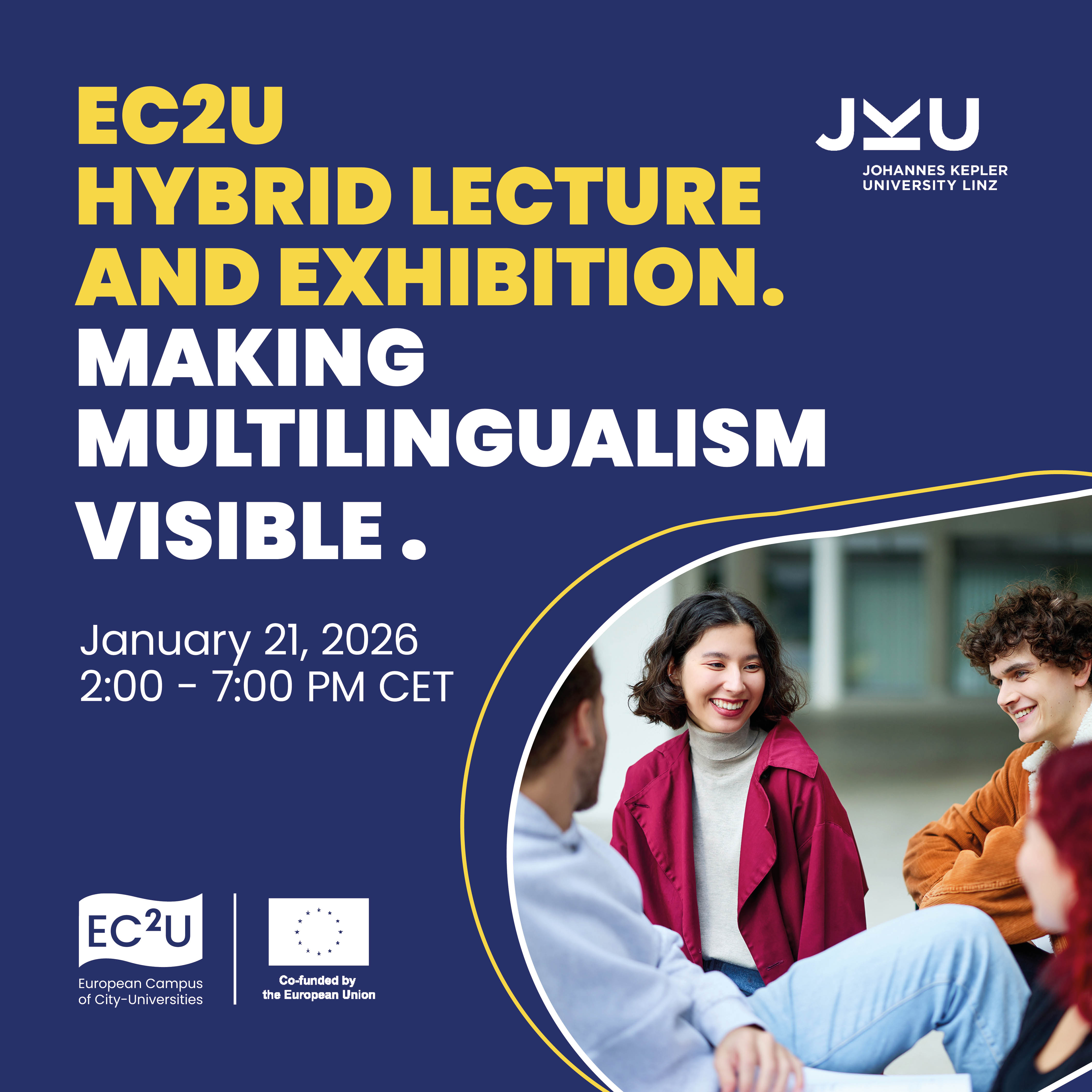 Evenimentul va avea loc miercuri, 21 ianuarie 2026, în intervalul 15:00–20:00 (ora României), în format hibrid: la JKU Linz și online, prin intermediul platformei Zoom (linkul de conectare va fi transmis după înregistrare). Prelegerea și expoziția abordează teme legate de multilingvism, diversitate lingvistică și abordări inovatoare în predarea limbilor, în concordanță cu angajamentul EC2U față de Obiectivul de Dezvoltare Durabilă 4 – Educație de calitate.