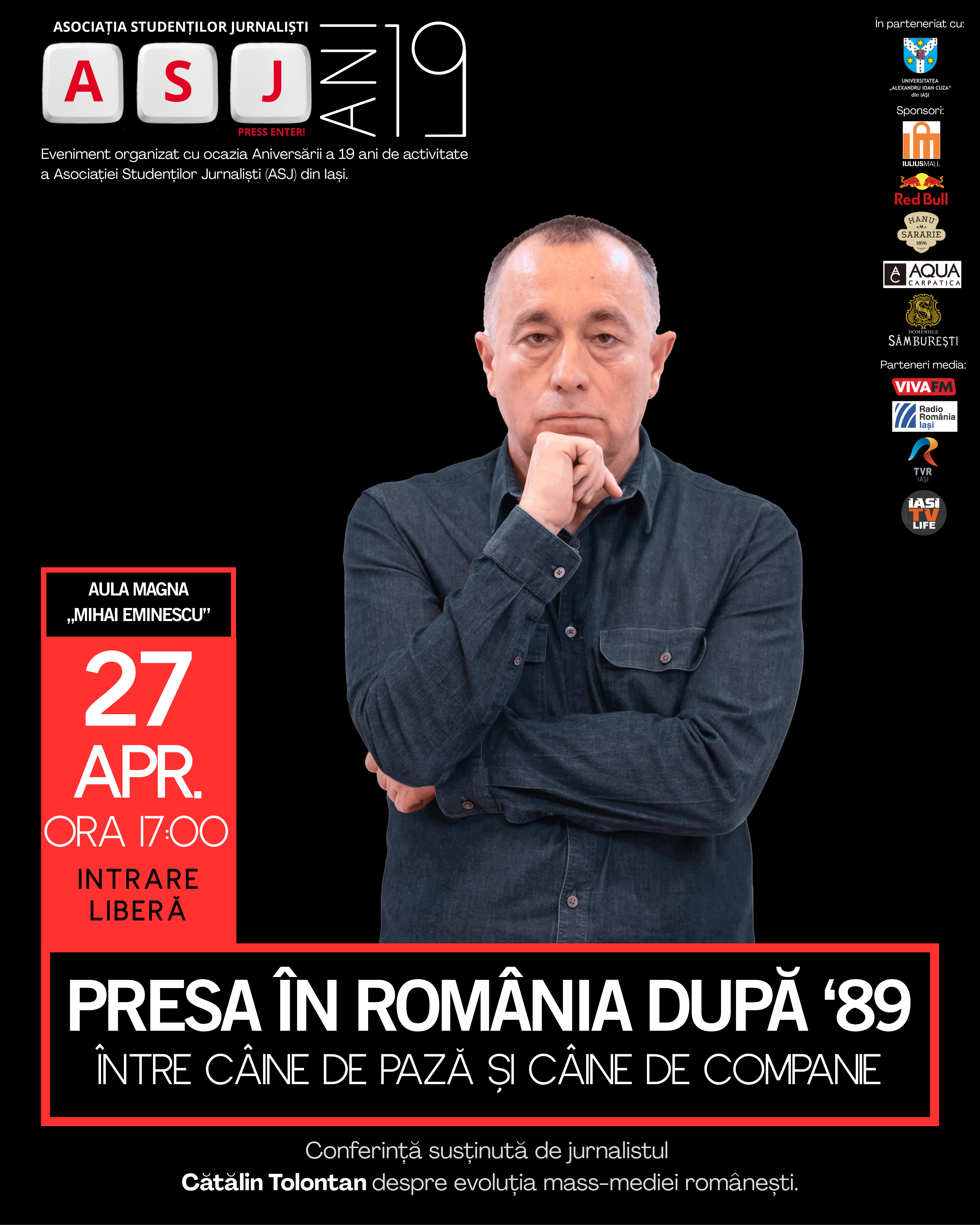 Asociația Studenților Jurnaliști din Iași (ASJ) are onoarea de a vă invita la Gala Aniversară de 19 ani, care îl are ca invitat pe reputatul jurnalist Cătălin Tolontan. În deschiderea evenimentului vor susține discursuri prof. univ. dr. Daniel Condurache și lect. univ. dr. Lucian Bălănuță.